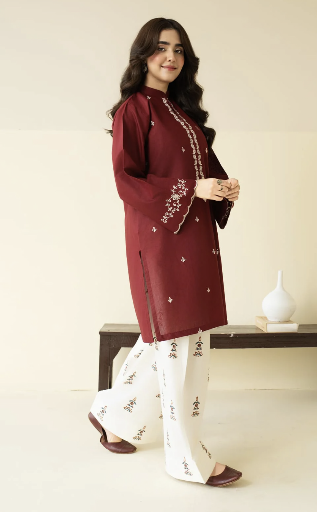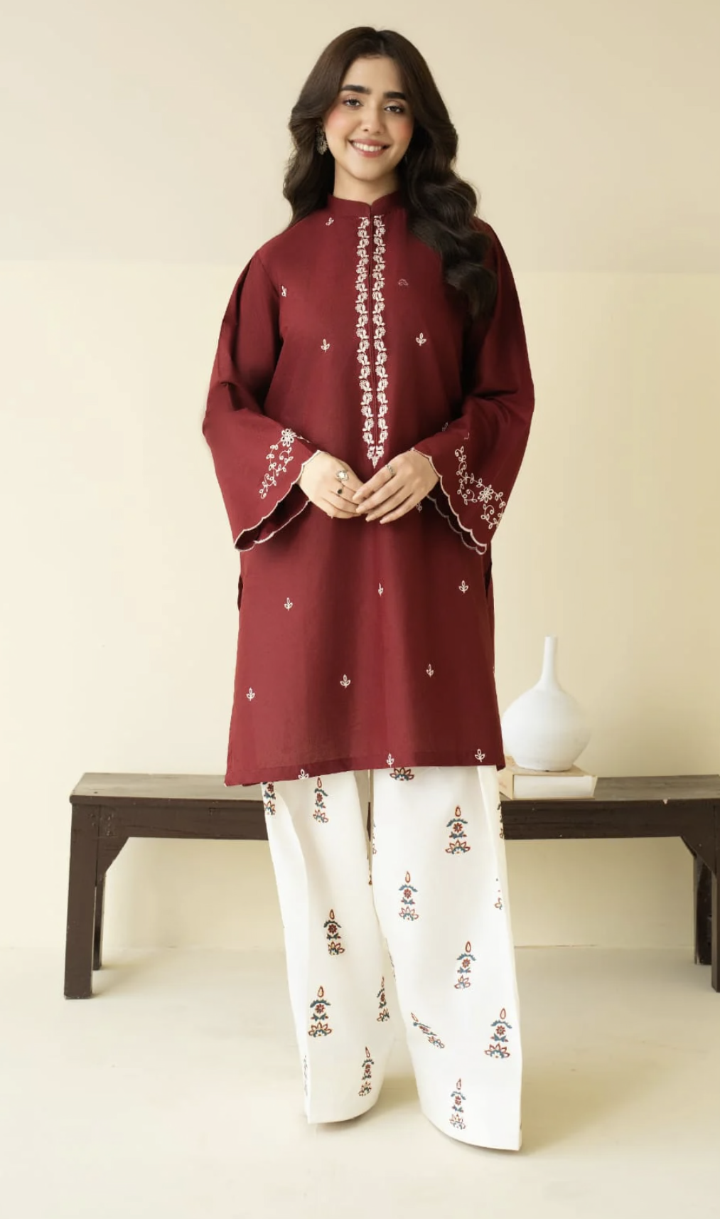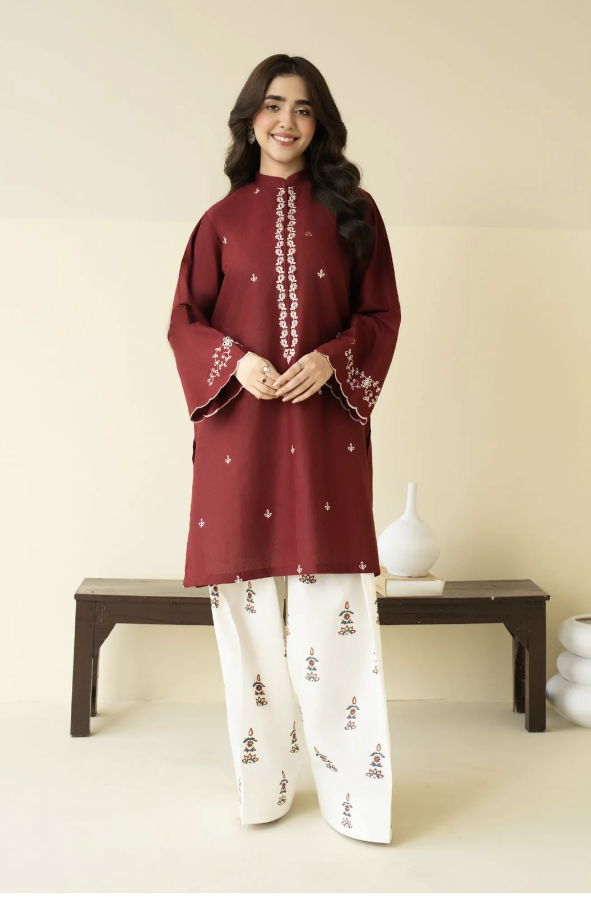 A rich maroon embroidered kurta paired with a trendy block-printed farshi shalwar, blending timeless elegance with contemporary charm.