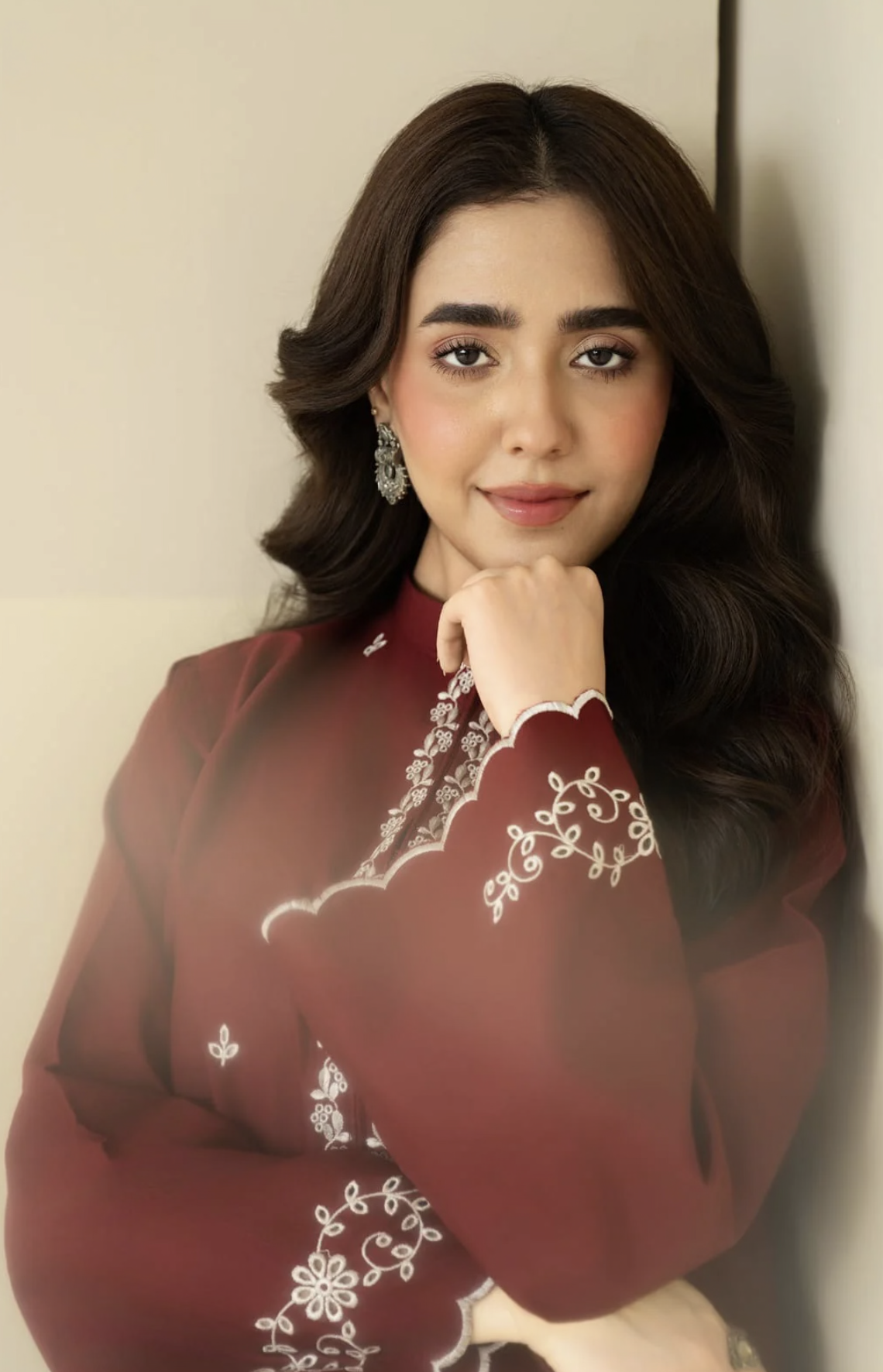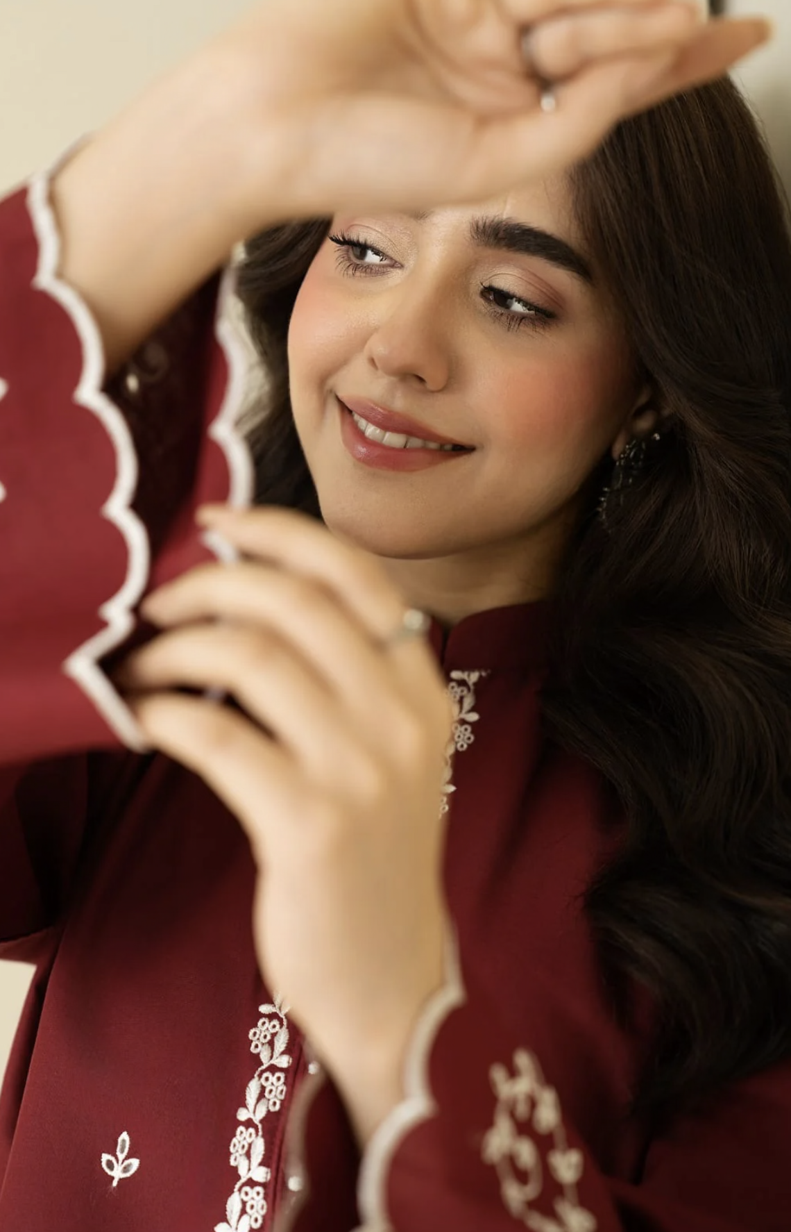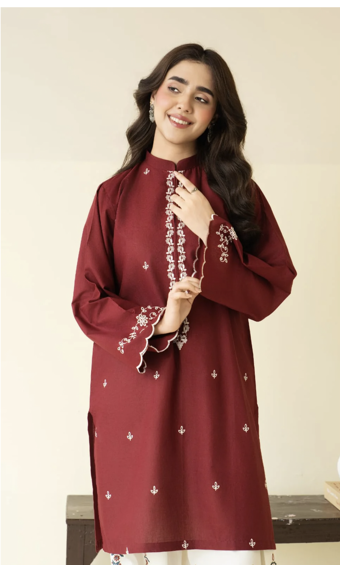 A rich maroon embroidered kurta paired with a trendy block-printed farshi shalwar, blending timeless elegance with contemporary charm.
